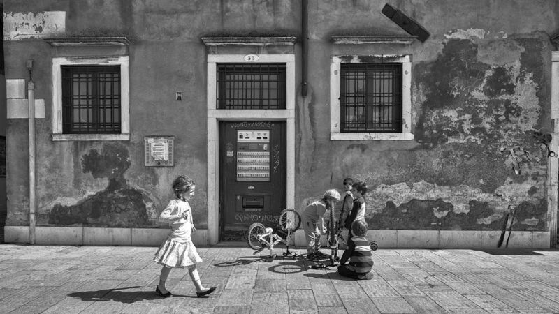 Quattro bambini intenti nella manutenzione dei loro veicoli a due ruote ed una vezzosa bambina che con un gesto del dito sembra quasi voler distogliere l’attenzione dei bambini dal grasso delle catene e dalla pressione delle ruote.