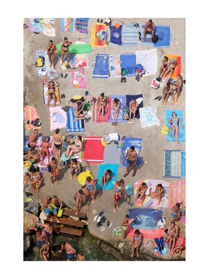 Parlavo di tessere, perché la foto si compone di infinite tessere, è un puzzle. Una foto di architettura. Una architettura orizzontale, quasi ci scommetterei che Vito si occupa di architettura. Il fotografo è in alto, guarda dallo zenit in basso, è distante, spettatore, ma è buono. Osserva e si mette in disparte, delicatamente, non vuole essere attore. Non vuol mettersi in mostra, non vuole stupire con trucchi da mago, non usa filtri, specchietti o trappole per allodole. Sparisce e il suo occhio diventa il nostro, siamo lì. Gli asciugamani per terra, stesi in modo ordinato, fanno pensare alle finestre di un affollato condominio di periferia che si affaccia sulla vita quotidiana, la gente va e viene immersa nel suo daffare quotidiano ... la Comédie humaine.... vista con dolcezza e partecipazione, con un sorriso. Ci sono mille piccole storie in questa fotografia, possiamo soffermarci con lo sguardo, isolarle, leggerle una ad una. La vita è così, facciamocene una ragione. Tutto concorre in questa foto a renderla meritevole del primo posto. Perfetta l'idea, l'inquadratura, la tecnica di ripresa, la postproduzione garbata. Complimenti Vito Leone, primo premio assoluto, meritatissimo.