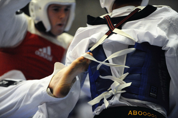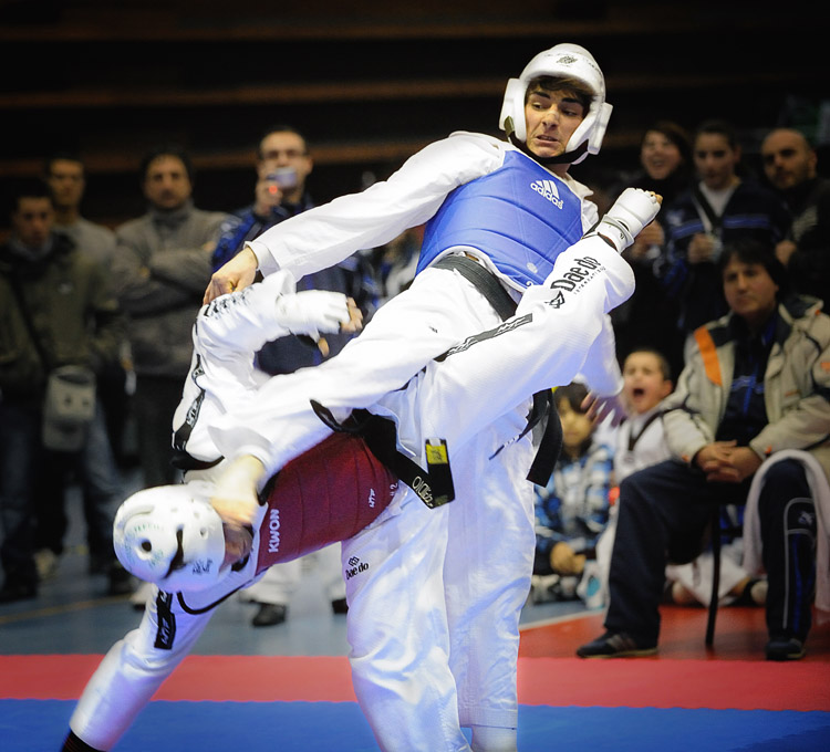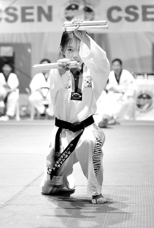 la scarsa illuminazione che appiattisce molto contrasti e cromacità generale, la volocità con la quale gli atleti si affrontano e, non per ultimo, il color bianco del dobok (la divisa degli atleti). È come se dovessimo fotografare due spose in abito bianco che si azzuffano in una buia sacrestia.